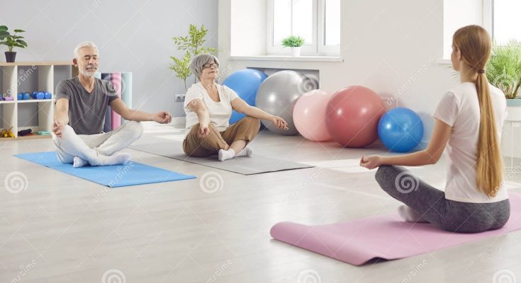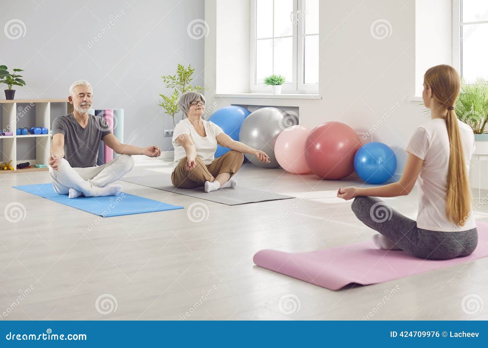 Elderly Couple Meditating In Lotus Position During Yoga Session With Coach. Elderly couple meditates in the lotus position during a yoga session with coach. Zen meditation, training, and relaxation, focusing on the senior couple mental and physical health during the practice.